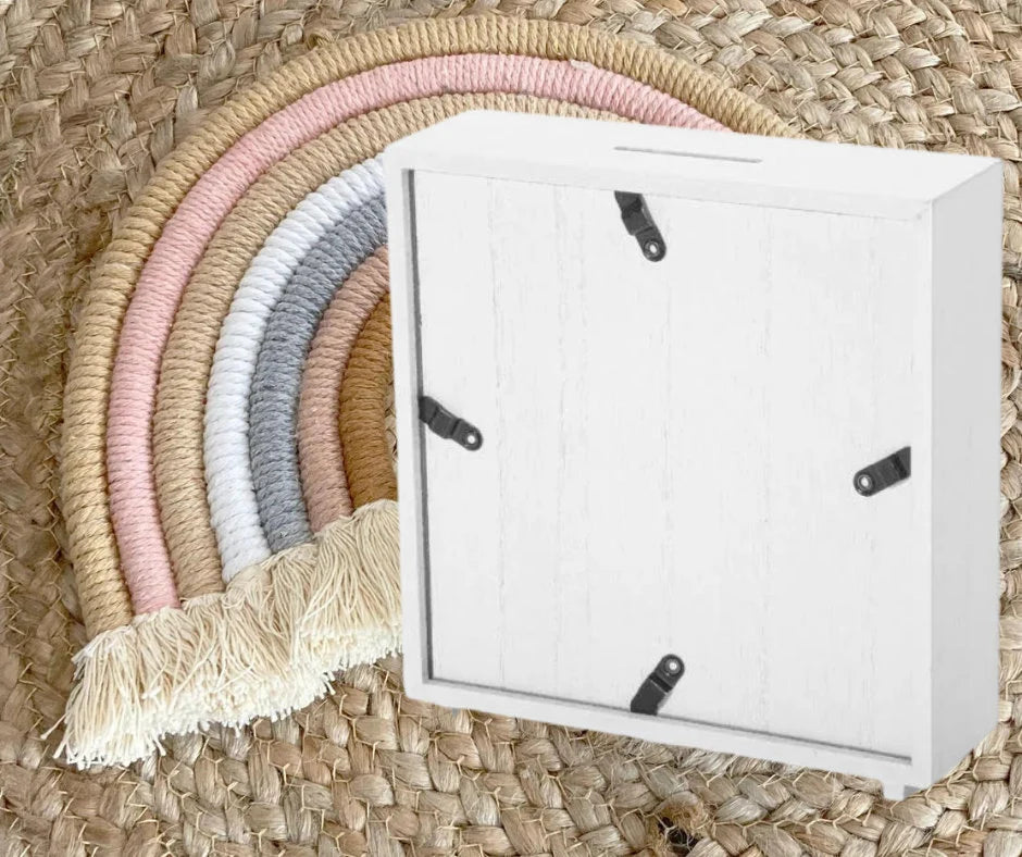 Crafted from high-quality wood for durability and a timeless appearance, the money box's crisp, white finish lends a contemporary and timeless appeal to any room or interior setting. Its sturdy construction not only safeguards your savings but also adds a refined touch to your living environment, with a slot in the top of which coins and notes can be added and a rubber bung in the underneath for the removal of said monies. The back panel can be easily removed (the same as a picture frame) in order to access the inside of the frame.