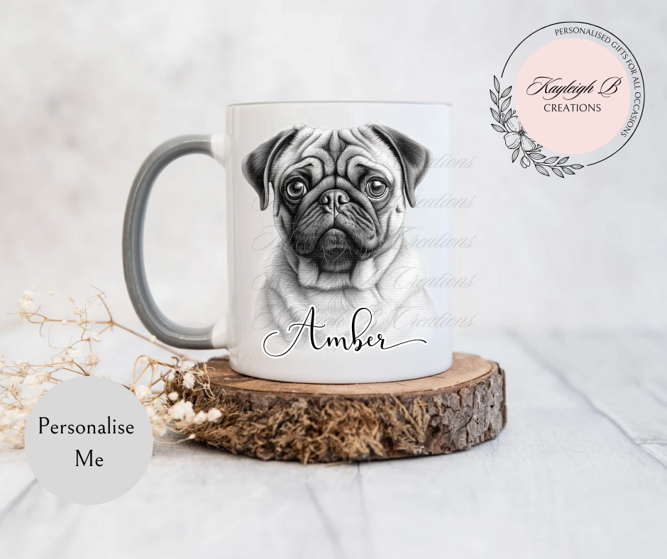 Pug Mug, Fawn, Adults & Puppies, Personalised, Sketchy Dog Design, Gift for Mum, Dad, Sister, Brother, Birthday, Dog Lover